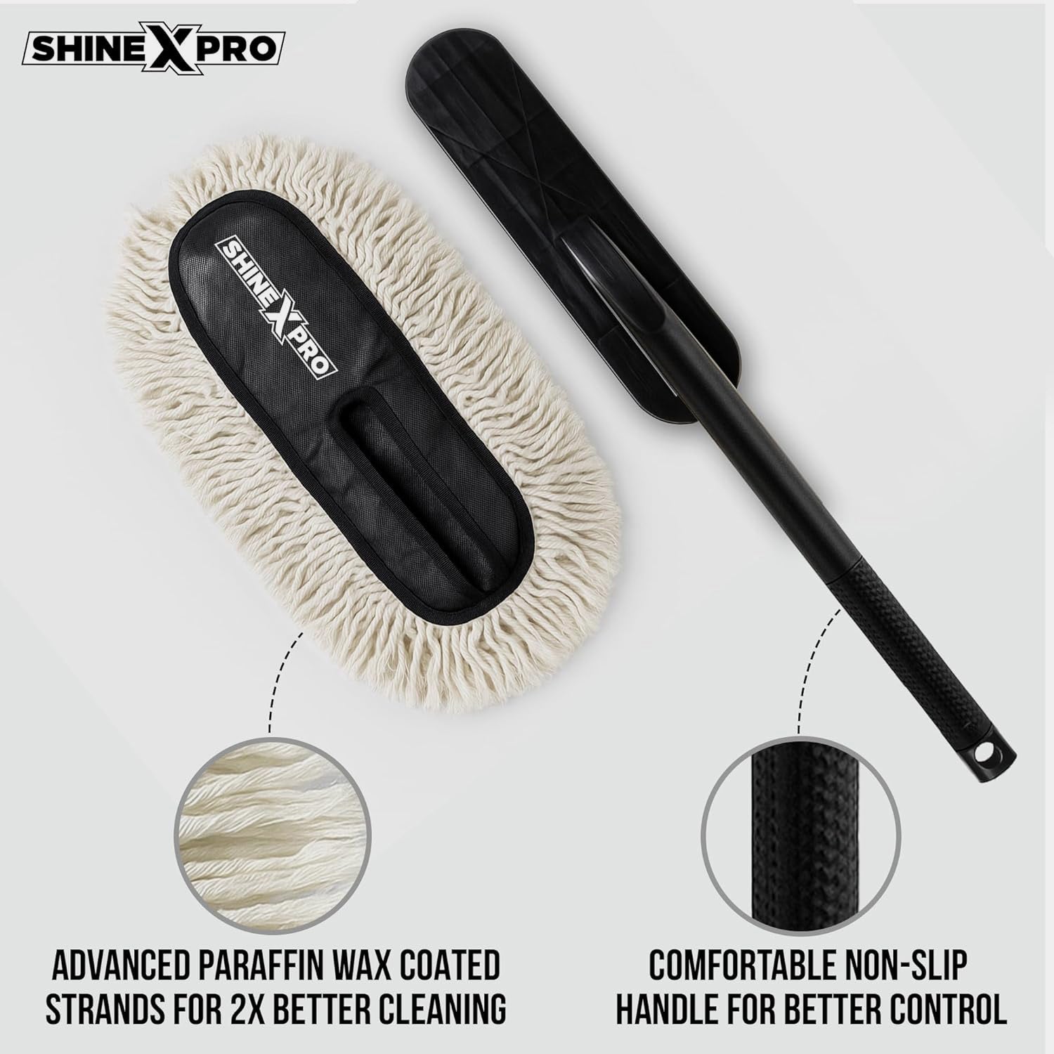 Keep your car spotless in minutes with the ShineXPro Car Duster. Designed for quick, waterless cleaning, it effortlessly lifts dust, dirt, and pollen without sprays or rinsing. The upgraded paraffin wax–coated threads deliver 2x better cleaning power, while the thick, high-density weave traps more dust with every swipe. Safe on paint, glass, and all exterior surfaces, it’s completely lint-free and scratch-free for a flawless shine. Finished with a long, ergonomic, easy-grip handle, the ShineXPro Car Duster lets you comfortably reach roofs, windshields, and corners with ease.